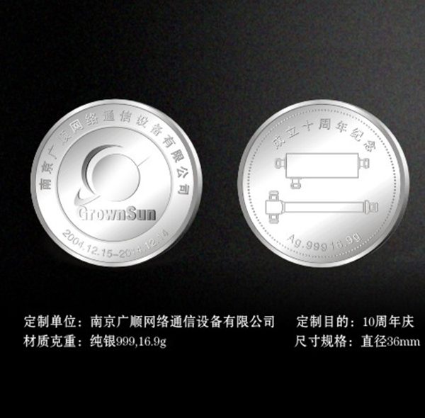 相關(guān)背景:南京廣順網(wǎng)絡(luò)通信設(shè)備有限公司為慶祝公司成立十周年慶,定制了金銀紀(jì)念幣禮品,產(chǎn)品設(shè)計大氣,包裝精美