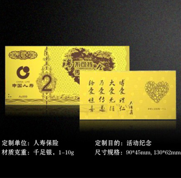 相關(guān)背景:人壽保險(xiǎn)為慶?;顒?dòng)紀(jì)念,定制了金銀條鈔品,產(chǎn)品設(shè)計(jì)大氣,包裝精美
